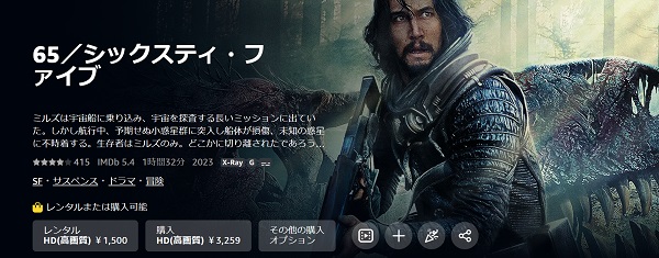 映画「65-シックスティ・ファイブ-」はAmazonプライムビデオでもフルで視聴することができます。