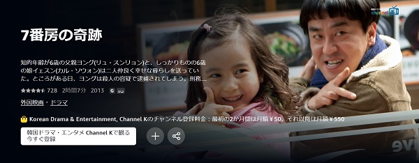 映画「7番房の奇跡」を視聴するには、追加チャンネルの「韓国ドラマ&エンタメ Channel K」に登録が必要です。
