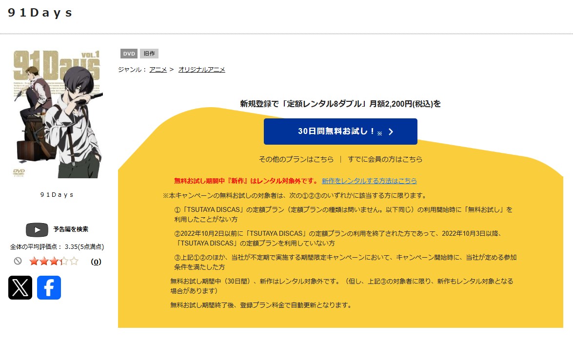 TSUTAYA DISCASで「91Days」のDVDを全話視聴