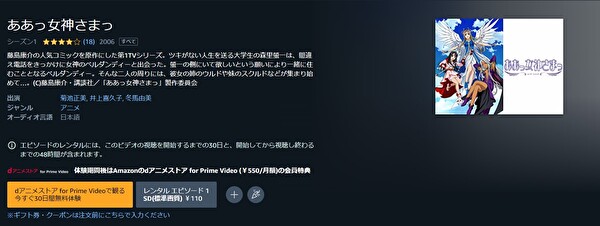 Amazonプライムはアニメ「ああっ女神さまっ(1期)」は無料で視聴できませんが、関連動画やシリーズ作品には見放題で配信されているものもあります。