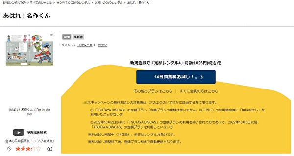 TSUTAYA DISCASは、準新作は8枚まで、話題作・旧作は枚数制限なしでお試し期間中に無料レンタルができ「あはれ!名作くん(1期)」のアニメは、旧作なので無料視聴可能です。
