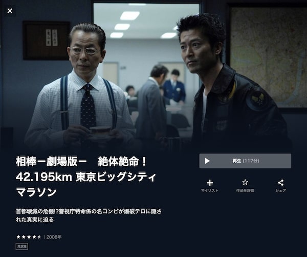 また、映画「相棒 -劇場版- 絶体絶命! 42.195km 東京ビッグシティマラソン」の関連作品の映画もフル視聴が可能ですよ