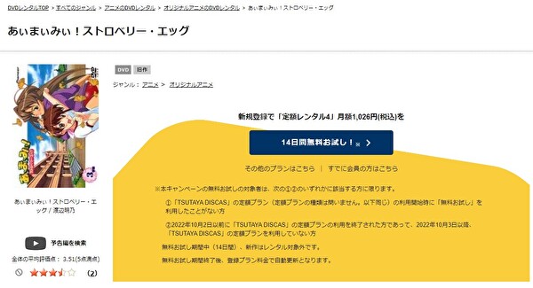 動画配信サービスとは少し違い、DVDレンタルサービスになりお試し期間で、「あぃまぃみぃ!ストロベリー・エッグ」の動画を全話視聴することができます。