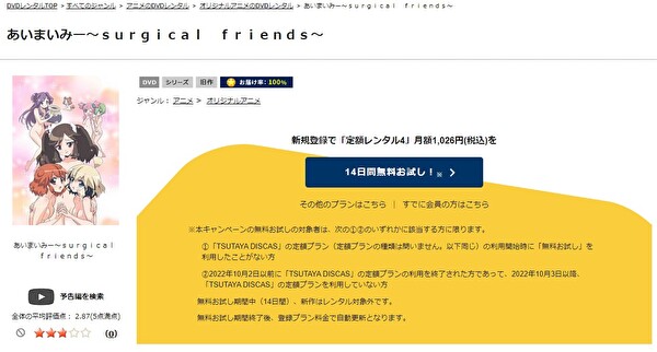 TSUTAYA DISCASは、準新作は8枚まで、話題作・旧作は枚数制限なしでお試し期間中に無料レンタルができ「あいまいみー~Surgical Friends~」のアニメは、旧作なので無料視聴可能です。