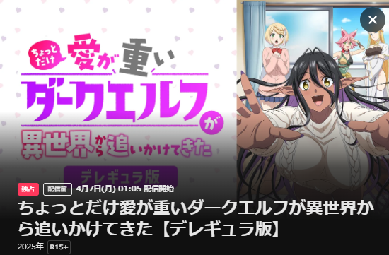 U-NEXTでアニメ「ちょっとだけ愛が重いダークエルフが異世界から追いかけてきた」の動画を無料トライアルで全話視聴