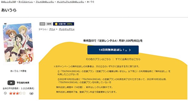 TSUTAYA DISCASは、準新作は8枚まで、話題作・旧作は枚数制限なしでお試し期間中に無料レンタルができ「あいうら」のアニメは、旧作なので無料視聴可能です。