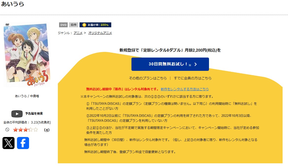 『TSUTAYA DISCAS』は初回登録限定で無料お試し期間があるため、その期間を利用すれば、アニメ「あいうら」を実質無料で全話視聴できますよ。