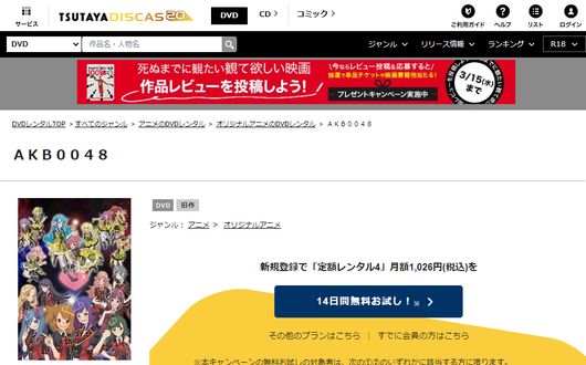 TSUTAYA DISCASは、準新作は8枚まで、話題作・旧作は枚数制限なしでお試し期間中に無料レンタルができ「AKB0048(1期)」のアニメは、旧作なので無料視聴可能です。