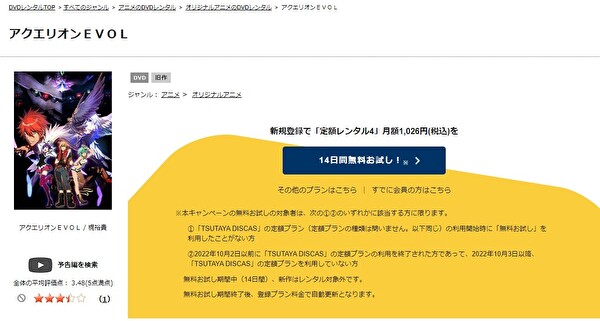 TSUTAYA DISCASは、準新作は8枚まで、話題作・旧作は枚数制限なしでお試し期間中に無料レンタルができ「アクエリオンEVOL」のアニメは、旧作なので無料視聴可能です。