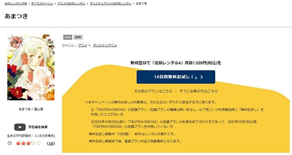 TSUTAYA DISCASは、準新作は8枚まで、話題作・旧作は枚数制限なしでお試し期間中に無料レンタルができ「あまつき」のアニメは、旧作なので無料視聴可能です。