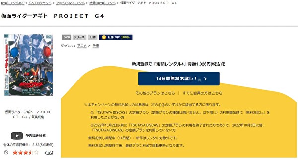 そして、映画「仮面ライダーアギト PROJECT G4」はツタヤディスカスで配信しているので、無料でDVDレンタルが可能です。