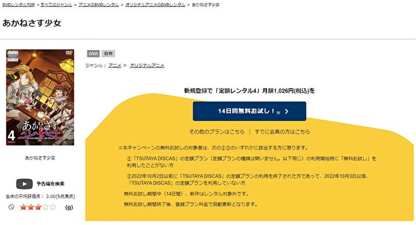 『TSUTAYA DISCAS』は初回登録で、14日間のお試し期間があるのでアニメ「あかねさす少女」をお試しで全話視聴することができますよ。