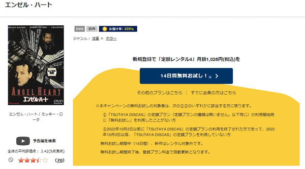 そして、映画「エンゼル・ハート」はツタヤディスカスで配信しているので、無料でDVDレンタルが可能です。