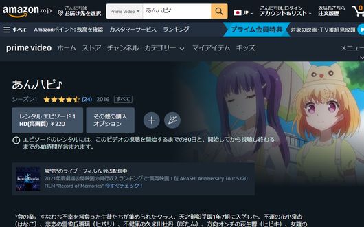 Amazonプライムはアニメ「あんハピ♪」は無料で視聴できませんが、関連動画やシリーズ作品には見放題で配信されているものもあります。