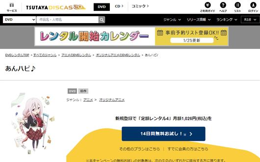 TSUTAYA DISCASは、準新作は8枚まで、話題作・旧作は枚数制限なしでお試し期間中に無料レンタルができ「あんハピ♪」のアニメは、旧作なので無料視聴可能です。