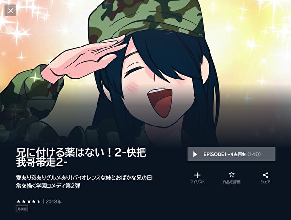 アニメ「兄に付ける薬はない!2-快把我哥帯走2-(2期)」の動画は視聴できませんが、月額500円と安いコストパフォーマンスが好評です。