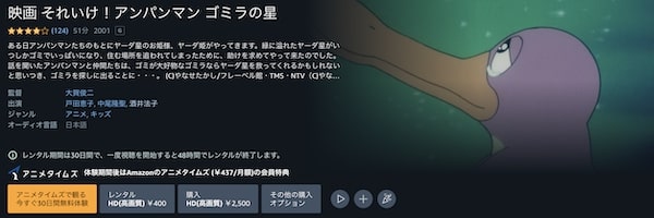 しかし、Amazonプライムビデオは無料期間が30日間ありますが、「それいけ!アンパンマン ゴミラの星」の映画はレンタル作品で400円かかってしまうため無料視聴することができません。