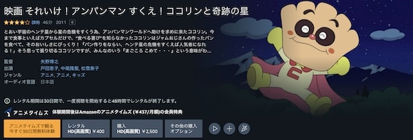 Amazonプライムビデオでも映画「それいけ!アンパンマン すくえ!ココリンと奇跡の星」はフルで視聴することができます。
