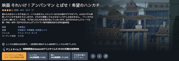 しかし、Amazonプライムビデオは無料期間が30日間ありますが、「それいけ!アンパンマン とばせ!希望のハンカチ」の映画はレンタル作品で%レンタル金額%かかってしまうため無料視聴することができません。