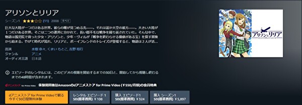 Amazonプライムはアニメ「アリソンとリリア」は無料で視聴できませんが、関連動画やシリーズ作品には見放題で配信されているものもあります。