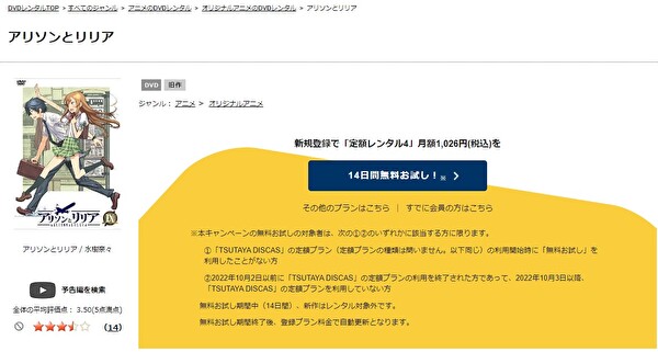 TSUTAYA DISCASは、準新作は8枚まで、話題作・旧作は枚数制限なしでお試し期間中に無料レンタルができ「アリソンとリリア」のアニメは、旧作なので無料視聴可能です。