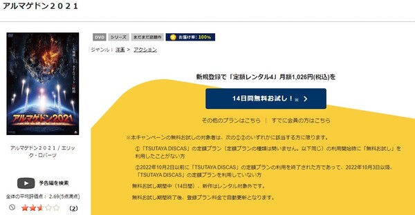 そして、映画「アルマゲドン2021」はツタヤディスカスで配信しているので、無料でDVDレンタルが可能です。