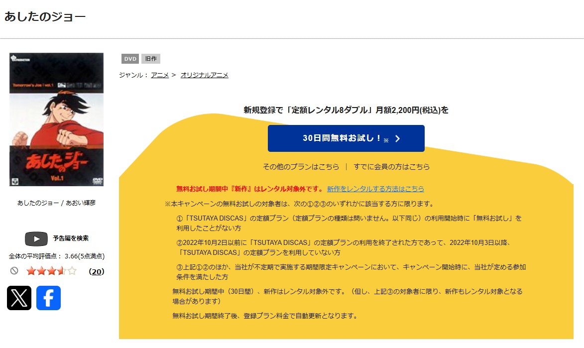 TSUTAYA DISCASで「あしたのジョー」のDVDを全話視聴