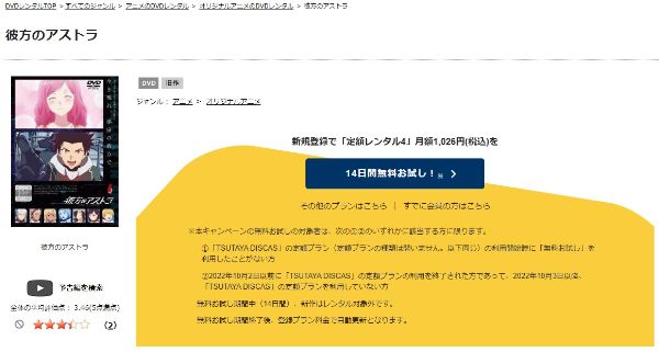 TSUTAYA DISCASは、準新作は8枚まで、話題作・旧作は枚数制限なしでお試し期間中に無料レンタルができ「彼方のアストラ」のアニメは、旧作なので無料視聴可能です。