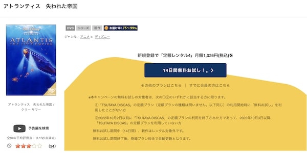 TSUTAYA DISCASは14日間無料期間があるので、そのお試し期間を利用することで映画「アトランティス 失われた帝国」を無料視聴することができるのです。