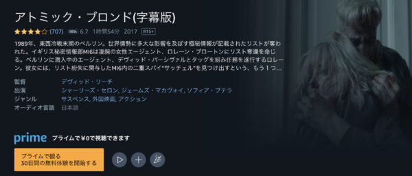 Amazonプライムビデオは、30日間のお試し無料期間があり「アトミック・ブロンド」の映画をフルで視聴することができます。