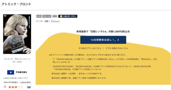 そして、映画「アトミック・ブロンド」はツタヤディスカスで配信しているので、無料でDVDレンタルが可能です。