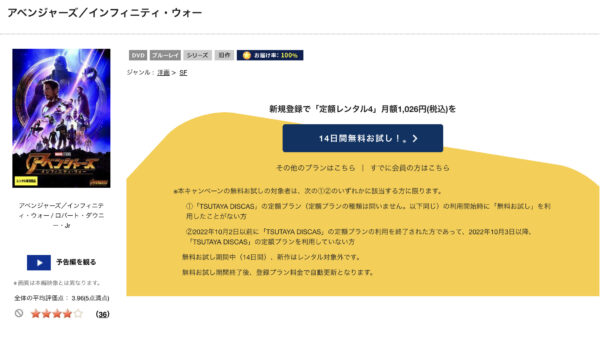 そして、映画「アベンジャーズ/インフィニティ・ウォー」はツタヤディスカスで配信しているので、無料でDVDレンタルが可能です。