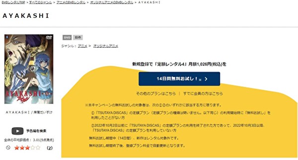 TSUTAYA DISCASは、準新作は8枚まで、話題作・旧作は枚数制限なしでお試し期間中に無料レンタルができ「AYAKASHI」のアニメは、旧作なので無料視聴可能です。