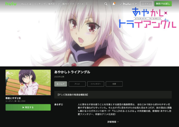 そして、アニメ「あやかしトライアングル」の関連作品もHuluで配信中で見放題で視聴できます。