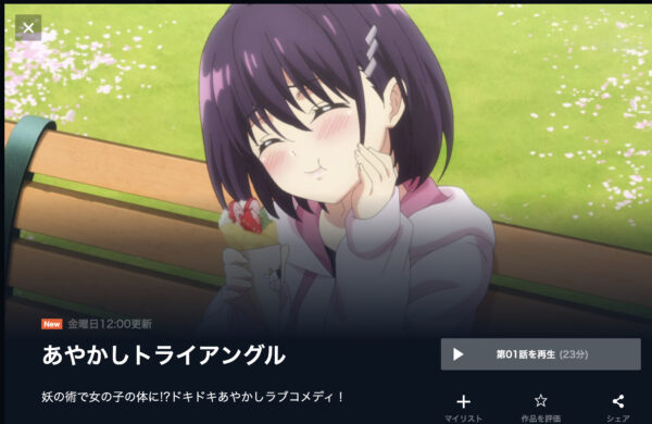 初回お試し期間が30日間あり、アニメ「あやかしトライアングル」の配信もあり1話から最新話(12話)まで見ることができます。