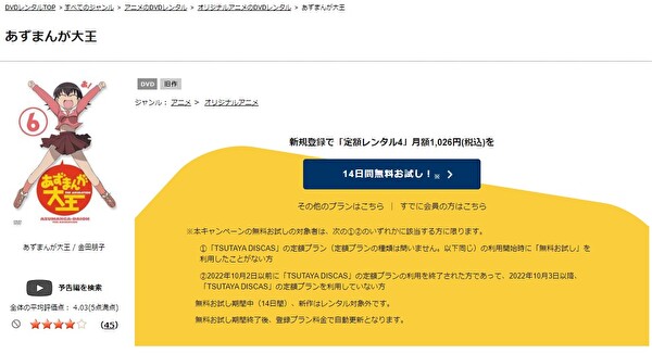 TSUTAYA DISCASは、準新作は8枚まで、話題作・旧作は枚数制限なしでお試し期間中に無料レンタルができ「あずまんが大王」のアニメは、旧作なので無料視聴可能です。