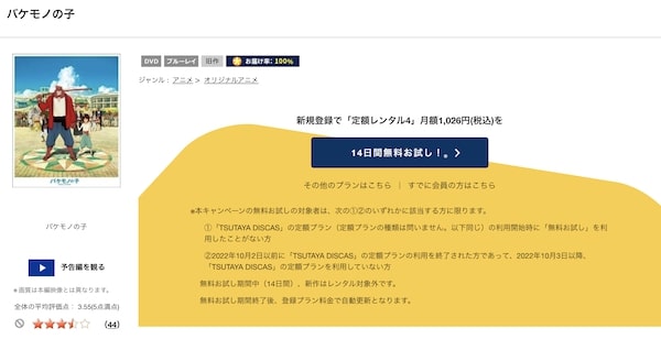 TSUTAYA DISCASのお試し期間中は、準新作・話題作・旧作が8枚まで無料レンタルができ、映画「バケモノの子」は、旧作なので無料視聴可能です。