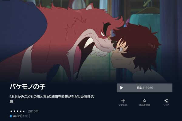 上記の特典が該当していて、アニメ映画「バケモノの子」を配信してる配信サイトを紹介します。