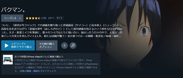 アニメ「バクマン(2期)」はAmazonプライムで全話視聴できます。