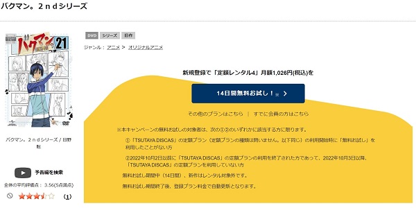 TSUTAYA DISCASは、準新作は8枚まで、話題作・旧作は枚数制限なしでお試し期間中に無料レンタルができ「バクマン(2期)」のアニメは、旧作なので無料視聴可能です。