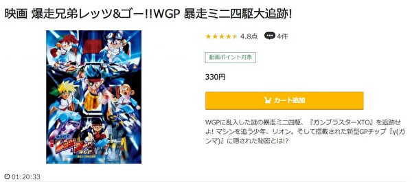 映画「映画 爆走兄弟レッツ&ゴー!!WGP 暴走ミニ四駆大追跡!」の動画は330円でレンタル配信してるので、フルで無料視聴できます。