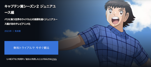 初回お試し期間が30日間あり、2024年11月現在、アニメ「キャプテン翼シーズン2 ジュニアユース編」の配信中でありフルで1話〜最新話(12話)まで見ることができます。