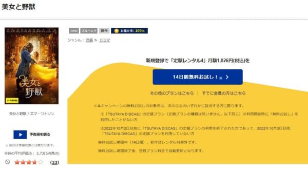 『TSUTAYA DISCAS』は14日間のお試し期間が初回特典で利用できるので「美女と野獣」の動画をフルで無料視聴できますよ。