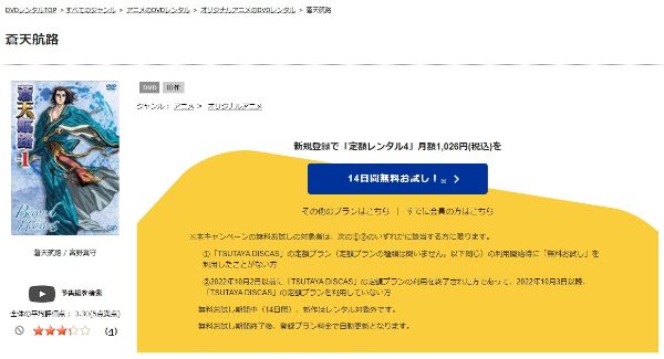 TSUTAYA DISCASは、準新作は8枚まで、話題作・旧作は枚数制限なしでお試し期間中に無料レンタルができ「蒼天航路」のアニメは、旧作なので無料視聴可能です。