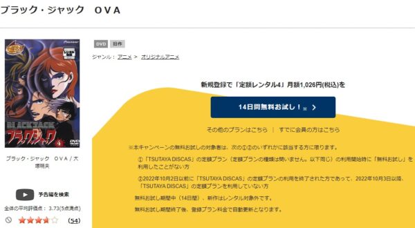 TSUTAYA DISCASは、準新作は8枚まで、話題作・旧作は枚数制限なしでお試し期間中に無料レンタルができ「ブラック・ジャック<OVA> 」のアニメは、旧作なので無料視聴可能です。