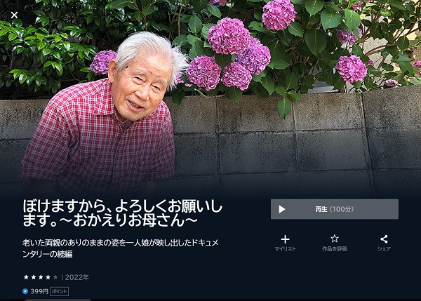 映画「ぼけますから、よろしくお願いします。~おかえりお母さん~」をU-NEXTで視聴するのに399円のレンタル料金がかかります。