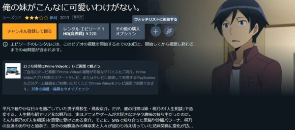 Amazonプライムはアニメ「俺の妹がこんなに可愛いわけがない。(2期)」は無料で視聴できませんが、関連動画やシリーズ作品には見放題で配信されているものもあります。
