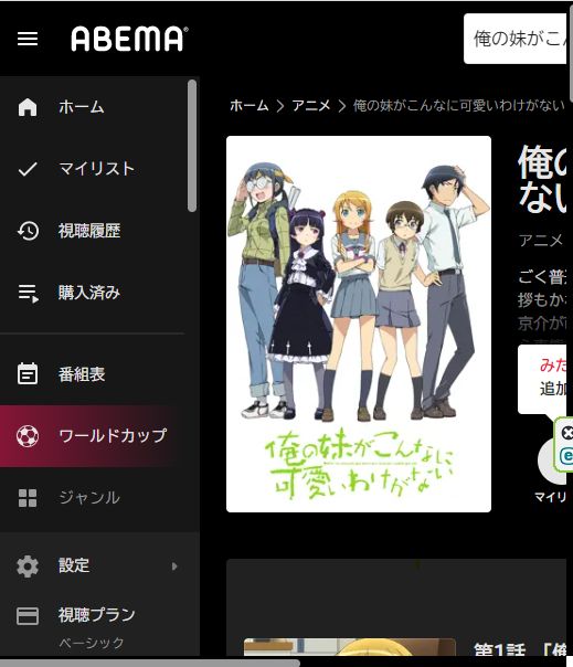 お試し期間の2週間でアニメ以外も視聴できるABEMA。アニメ「俺の妹がこんなに可愛いわけがない(1期)」を全話視聴した後も楽しめるので是非、おためしください。