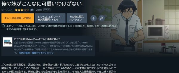 Amazonプライムはアニメ「俺の妹がこんなに可愛いわけがない(1期)」は無料で視聴できませんが、関連動画やシリーズ作品には見放題で配信されているものもあります。