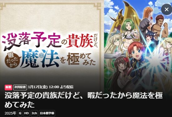 アニメ「没落予定の貴族だけど、暇だったから魔法を極めてみた」が全話無料視聴できる動画配信サイトを調査しました。